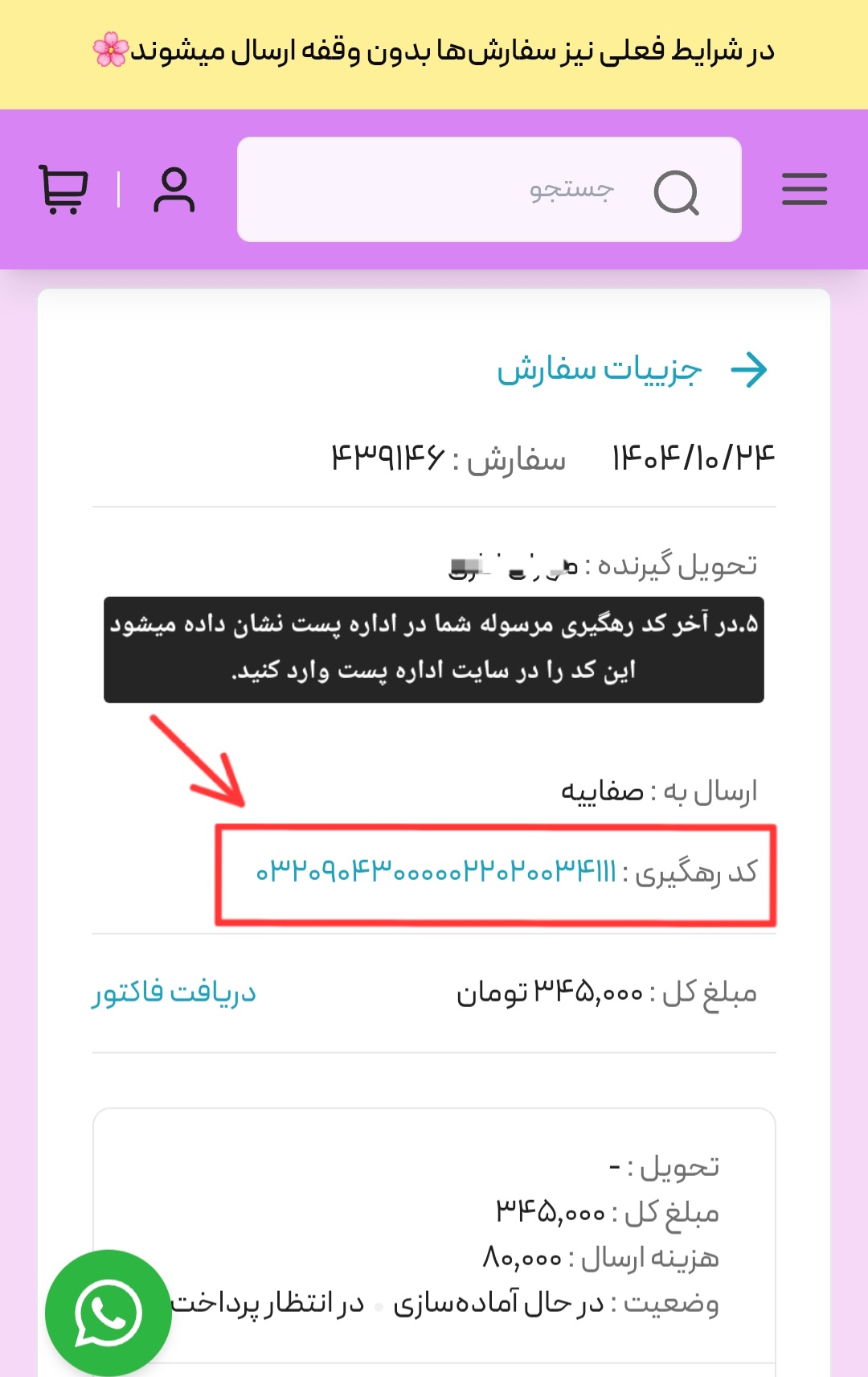 اما اگر براتون پیامک ارسال نمیشود برای پیدا کردن کد رهگیری مرسوله خود رو لینک های زیر کلیک کرده و مراحل گفته شده را انجام دهید🌸