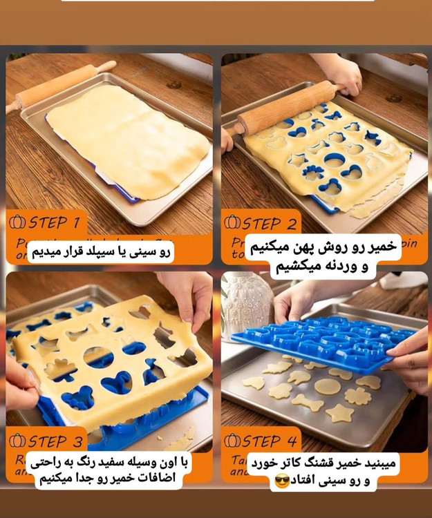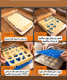 یک روش استفاده از این کاتر به این صورت است که کاتر را برعکس روی سینی فر قرار داده و خمیر را روی آن پهن کنید و به آرامی روی خمیر را وردنه بکشید.فشار وردنه باعث میشود که کاتر آن را برش داده و خمیر به شکل های مختلف روی سینی فر قرار بگیرد.سپس صفحه کاتر را برداشته ،با استفاده از صفحه سفید رنگ به راحتی اضافات خمیر جدا میشود.